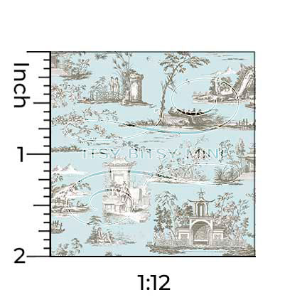 Adorn your dollhouse with Chinoiseries Blue Toile - Rose Hill - Dollhouse Wallpaper. This miniature wallpaper features an elegant oriental toile pattern in a delicate pale blue color. The design is sure to bring a touch of sophistication to any dollhouse interior.