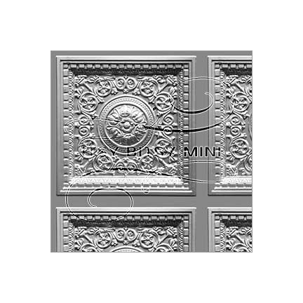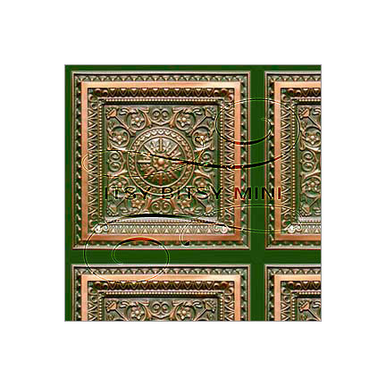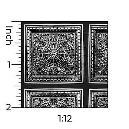 Dollhouse wallpaper ceiling tiles to simulate paneled wall or coffered ceiling. Paper is flat and not physically embossed. It is a trompe l'oeil effect to mimic metal or engraved wood. Consider using the paper to accent a door or cabinet. You can use the smaller scales for border or backsplash.