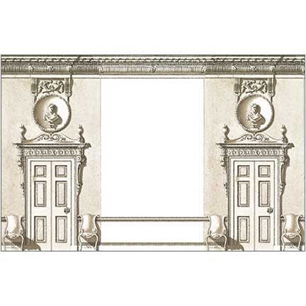 Mural of multiple decorative panel repeats. Wallpaper can also be cut apart and spaced to accommodate a wall of any dimension (consider using the matching background paper). This paper can be combined with other papers to complete a room.