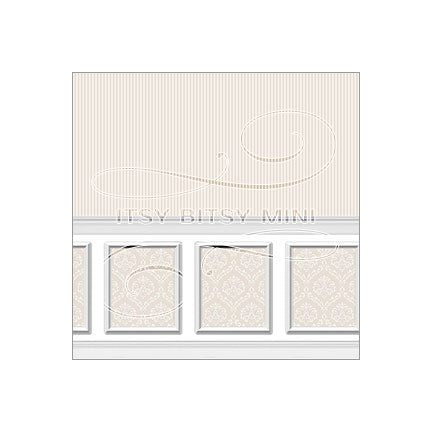 Soft colored damask inset panels in pale blue, gray or beige. Adding architectural details has never been easier. Our dollhouse wainscot mural can be used to accent one wall or surround the entire room. The panels can be cut apart and companion prints can be used to create a customize a room to your exact specifications.