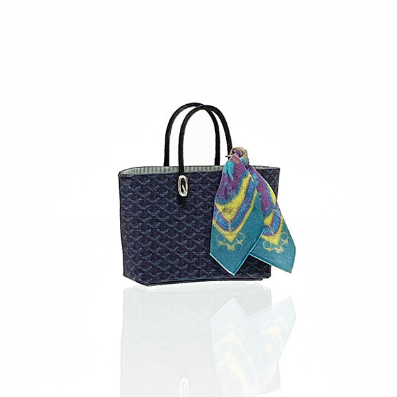 HANDBAG - One inch scale dollhouse miniature handbag. The purse body is 1 x 1-1/8 X 1/2 in (2.8 X 2.9 X 1.2 cm). With handles, the bag measures 1 1/2 in tall (4 cm). Bag has tiny silver metal feet.