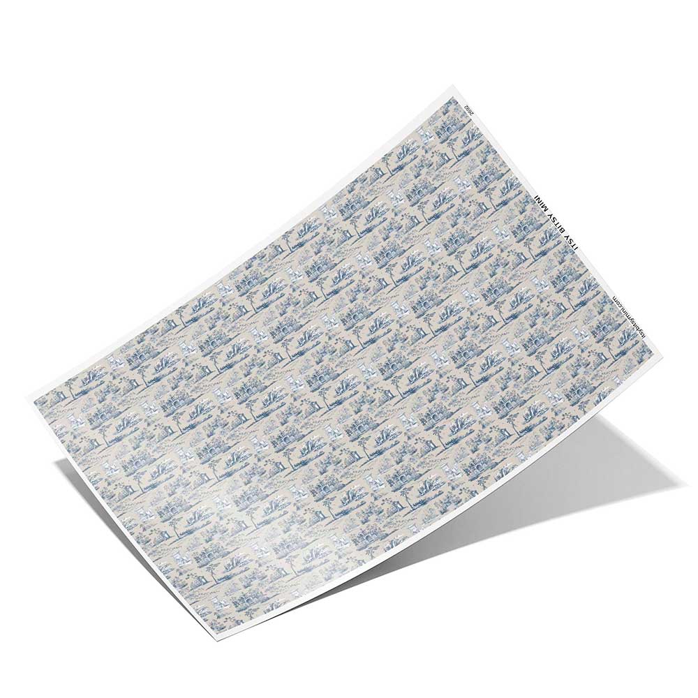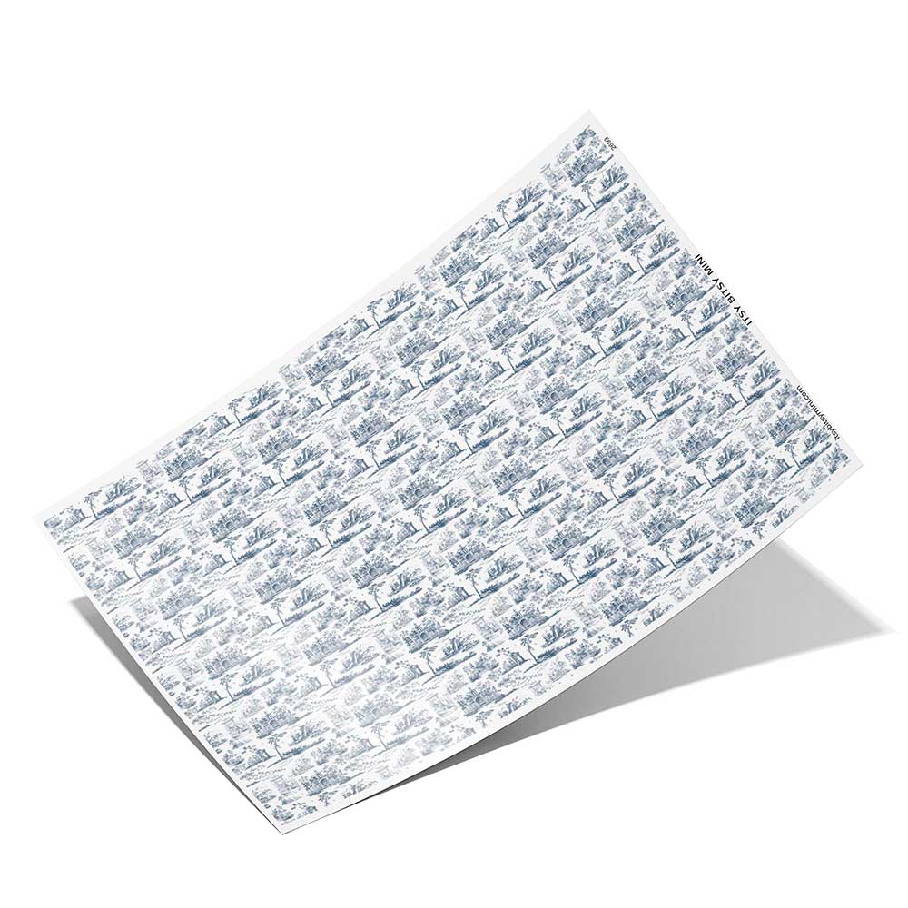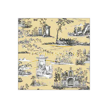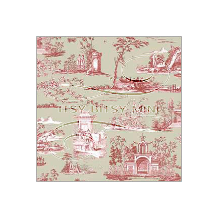This charming oriental toile dollhouse wallpaper effortlessly adds a world traveled sophistication to your dollhouse interiors. Chinoiserie toile is available in blue, pink, green, purple, red and yellow colorways.
